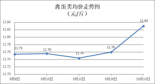 禽蛋类商品价格小幅上升。所监测的5种禽蛋类商品价格波动情况为4涨1平,综合零售均价为每斤11.83元,环比上涨0.60%。其中:白条鸡、白条鸭零售均价分别为每斤20.31元、15.32元,环比分别上涨0.49%、持平;鸡蛋、鸭蛋零售均价分别为每斤6.57元、7.77元,环比分别上涨0.46%、上涨0.65%。