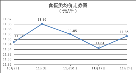 禽蛋类商品价格窄幅盘整。所监测的5种禽蛋类商品价格波动情况为2涨2跌1平,综合零售均价为每斤11.85元,环比上涨0.10%。其中:白条鸡、白条鸭零售均价分别为每斤20.39元、15.34元,环比分别上涨0.05%、下降0.13%;鸡蛋、鸭蛋零售均价分别为每斤6.54元、7.79元,环比分别下降0.15%、上涨1.04%。