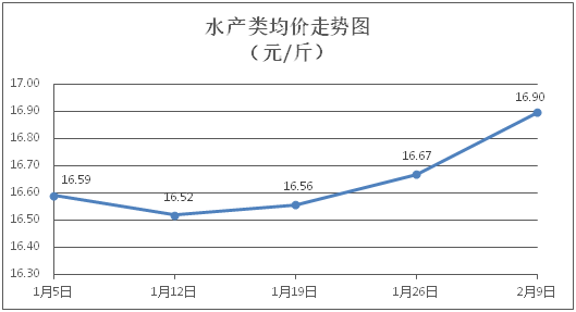 水产类商品价格以涨为主。所监测的9种水产商品价格波动情况为6涨2跌1平,综合均价为每斤16.90元,环比上涨1.37%。其中:草鱼、鲫鱼、鳙鱼、罗非鱼、基围虾零售均价分别为每斤11.29元、14.49元、10.94元、9.31元、30.82元,环比分别上涨2.17%、上涨1.97%、上涨3.70%、上涨2.31%、上涨3.88%。