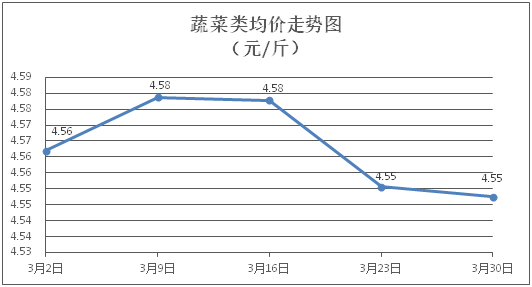 蔬菜类商品价格升降互现。所监测的32 种蔬菜商品价格波动情况为15涨14跌3平,综合零售均价为每斤4.55元,环比下降0.07%。其中:涨幅居前的品种包括青豆角、上海青、本地菜心,零售均价分别为每斤7.00元、3.68元、4.60元,环比分别上涨4.95%、4.84%、3.60%;跌幅靠前的品种包括丝瓜、白苋菜、西芹,零售均价分别为每斤5.27元、4.75元、4.72元,环比分别下降8.19%、3.85%、2.48%。