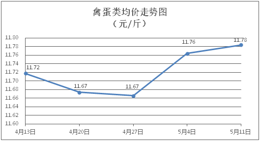 禽蛋类商品价格微幅上涨。所监测的5种禽蛋类商品价格波动情况为3涨1跌1平,综合零售均价为每斤11.78元,环比上涨0.17%。其中:白条鸡、白条鸭零售均价分别为每斤20.63元、15.24元,环比分别上涨0.19%、上涨0.20%;鸡蛋、鸭蛋零售均价分别为每斤6.65元、7.19元,环比分别上涨0.61%、下降0.14%。