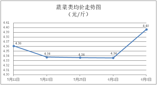 蔬菜类商品价格以涨为主。所监测的32 种蔬菜商品价格波动情况为26涨6跌,综合零售均价为每斤4.40元,环比上涨1.39%。其中:涨幅居前的品种包括花菜、白苋菜、莲藕,零售均价分别为每斤4.60元、4.15元、5.47元,环比分别上涨5.26%、5.06%、4.59%;跌幅靠前的品种包括苦瓜、芥兰、土豆,零售均价分别为每斤4.33元、5.18元、3.00元,环比分别下降2.70%、2.08%、0.66%。