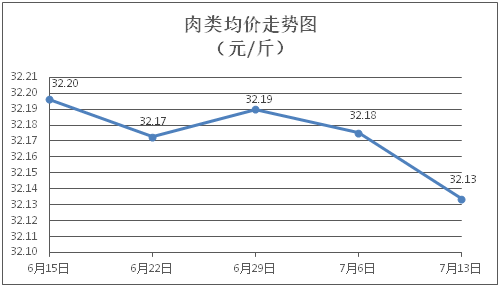 肉类商品价格微幅下降。所监测的8种肉类商品价格波动情况为7跌1平,综合零售均价为每斤32.13元,环比下降0.13%。其中:排骨、精瘦肉、肋条肉、牛肉、带骨羊肉零售均价分别为每斤30.19元、18.90元、15.72元、46.65元、42.19元,环比分别下降0.03%、下降0.21%、下降0.76%、下降0.06%、下降0.05%。