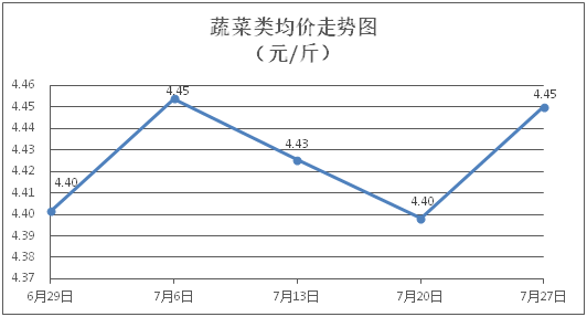 蔬菜类商品价格普遍上涨。所监测的32 种蔬菜商品价格波动情况为23涨4跌5平,综合零售均价为每斤4.45元,环比上涨1.18%。其中:涨幅居前的品种包括白苋菜、青豆角、水空心菜,零售均价分别为每斤4.22元、5.16元、3.87元,环比分别上涨6.30%、5.31%、4.03%;跌幅靠前的品种包括黄瓜、莲藕、花菜,零售均价分别为每斤3.71元、5.31元、4.57元,环比分别下降4.13%、1.48%、1.08%。