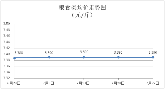 粮食类商品价格保持稳定。所监测的4种粮食类商品价格均持平,综合零售均价为每斤3.390元。其中:珍珠米、面粉零售均价分别为每斤3.10元、3.40元,环比均持平。