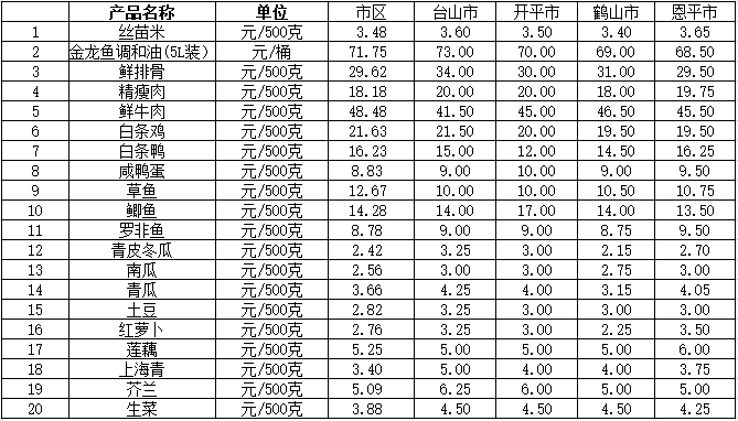 说明:1、表中价格为该地区监测点综合平均价;2、“市区”含蓬江区、江海区、新会区,价格分别采自蓬江市场、江南市场、城东市场等13家农贸市场;3、其他四个县市价格分别采自新华市场、锦江市场等8家农贸市场。
