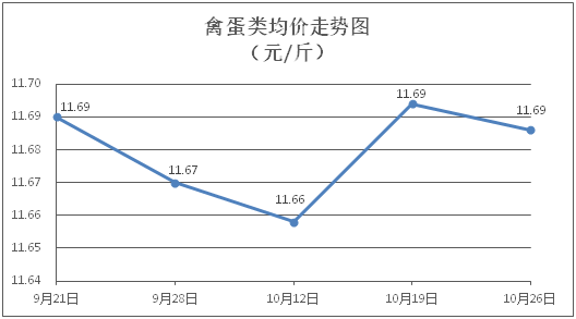禽蛋类商品价格稳中微降。所监测的5种禽蛋类商品价格波动情况为2跌3平,综合零售均价为每斤11.69元,环比下降0.07%。其中:白条鸡、白条鸭零售均价分别为每斤20.88元、15.20元,环比分别下降0.10%、下降0.13%;鸡蛋、鸭蛋零售均价分别为每斤6.39元、7.07元,环比均持平。