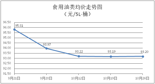食用油类商品价格基本平稳。所监测的9种食用油(5L装)商品价格波动情况为1涨8平,综合零售均价为每桶93.20元,环比上涨0.01%。其中:金龙鱼花生油、金龙鱼调和油零售均价分别为每桶100.65元、70.57元,环比分别持平、上涨0.16%。