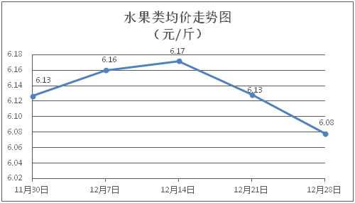 水果类商品价格总体略降。所监测的水果商品价格波动情况为2涨2跌2平,综合零售均价为每斤6.08元,环比下降0.82%。其中橙子、苹果、香蕉零售均价分别为每斤5.86元、7.99元、2.77元,环比分别下降3.93%、持平、上涨0.73%。
