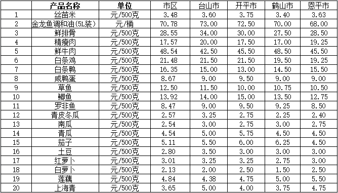 说明:1、表中价格为该地区监测点上周综合平均价;2、“市区”含蓬江区、江海区、新会区,价格分别采自蓬江市场、江南市场、城东市场等13家农贸市场;3、其他四个县市价格分别采自新华市场、锦江市场等8家农贸市场。