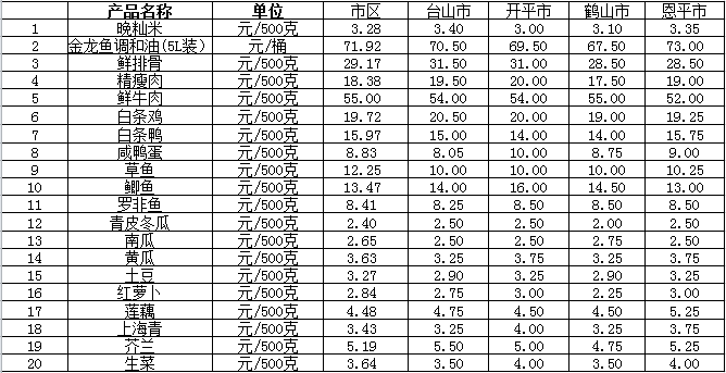 说明:1、表中价格为该地区监测点综合平均价;2、“市区”含蓬江区、江海区、新会区,价格分别采自蓬江市场、江南市场、城东市场等13家农贸市场;3、其他四个县市价格分别采自新华市场、锦江市场等8家农贸市场。