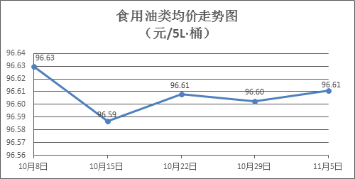 食用油类商品价格稳中微涨。上周所监测的9种食用油(5L装)商品价格波动情况为3涨6平,综合零售均价为96.61元/桶,环比上涨0.01%。其中:鲁花花生油、金龙鱼调和油零售均价分别为每桶157.41元、74.89元,环比分别上涨0.01%、持平。