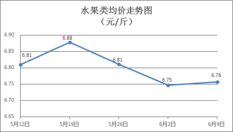 水果类商品价格升降互现。所监测的6种水果商品价格波动情况为3涨3跌,综合零售均价为每斤6.76元,环比上涨0.15%。其中橙子、香蕉、葡萄零售均价分别为每斤5.69元、2.95元、14.90元,环比分别上涨0.35%、上涨3.15%、下降0.20%。