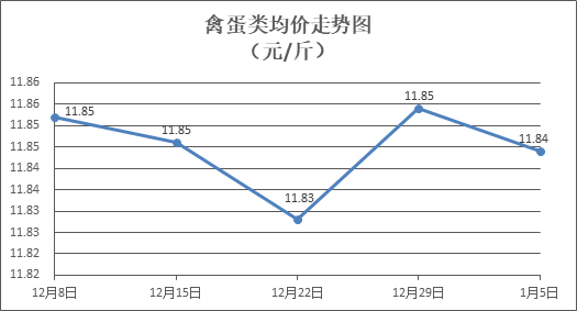 禽蛋类商品价格略有回调。所监测的5种禽蛋类商品价格波动情况为1涨3跌1平,综合零售均价为每斤11.84元,环比下降0.08%。其中:白条鸡、白条鸭零售均价分别为每斤20.61元、15.24元,环比分别下降0.19%、下降0.07%;鸡蛋、咸鸭蛋零售均价分别为每斤6.56元、9.14元,环比分别上涨0.15%、下降0.11%。