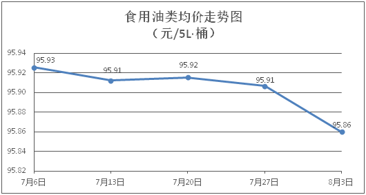 食用油类商品价格稳中微降。所监测的9种食用油(5L装)商品价格波动情况为2跌7平,综合零售均价为每桶95.86元,环比下降0.05%。其中:金龙鱼花生油、金龙鱼调和油零售均价为每桶102.83元、70.89元,环比分别持平、下降0.49%。