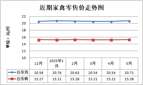 白条鸡、白条鸭零售均价分别为每斤20.71元、15.28元,环比分别上涨0.83%、上涨0.39%,同比分别上涨3.29%、上涨2.07%;鸡蛋、咸鸭蛋零售均价分别为每斤6.65元、9.21元,环比分别上涨0.15%、持平,同比分别上涨4.88%、上涨3.72%。