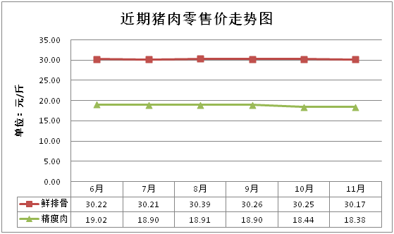 鲜排骨、精瘦肉、牛肉、带骨羊肉零售均价分别为每斤30.17元、18.38元、46.89元、41.17元,环比分别下降0.43%、下降0.33%、下降0.09%、上涨3.31%,同比分别下降6.42%、下降8.46%、上涨2.34%、下降1.29%。