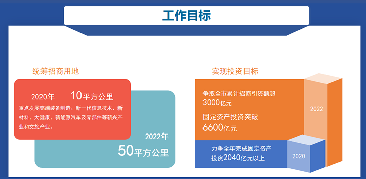 在较高基数的基础上,《若干措施》按照未来年均10%以上增长的目标,提出我市今年首批推出10平方公里,到2022年共统筹50平方公里产业用地用于招商,争取今年完成固定资产投资2040亿元以上,未来三年招商引资额超3000亿元、固定资产投资突破6600亿元。