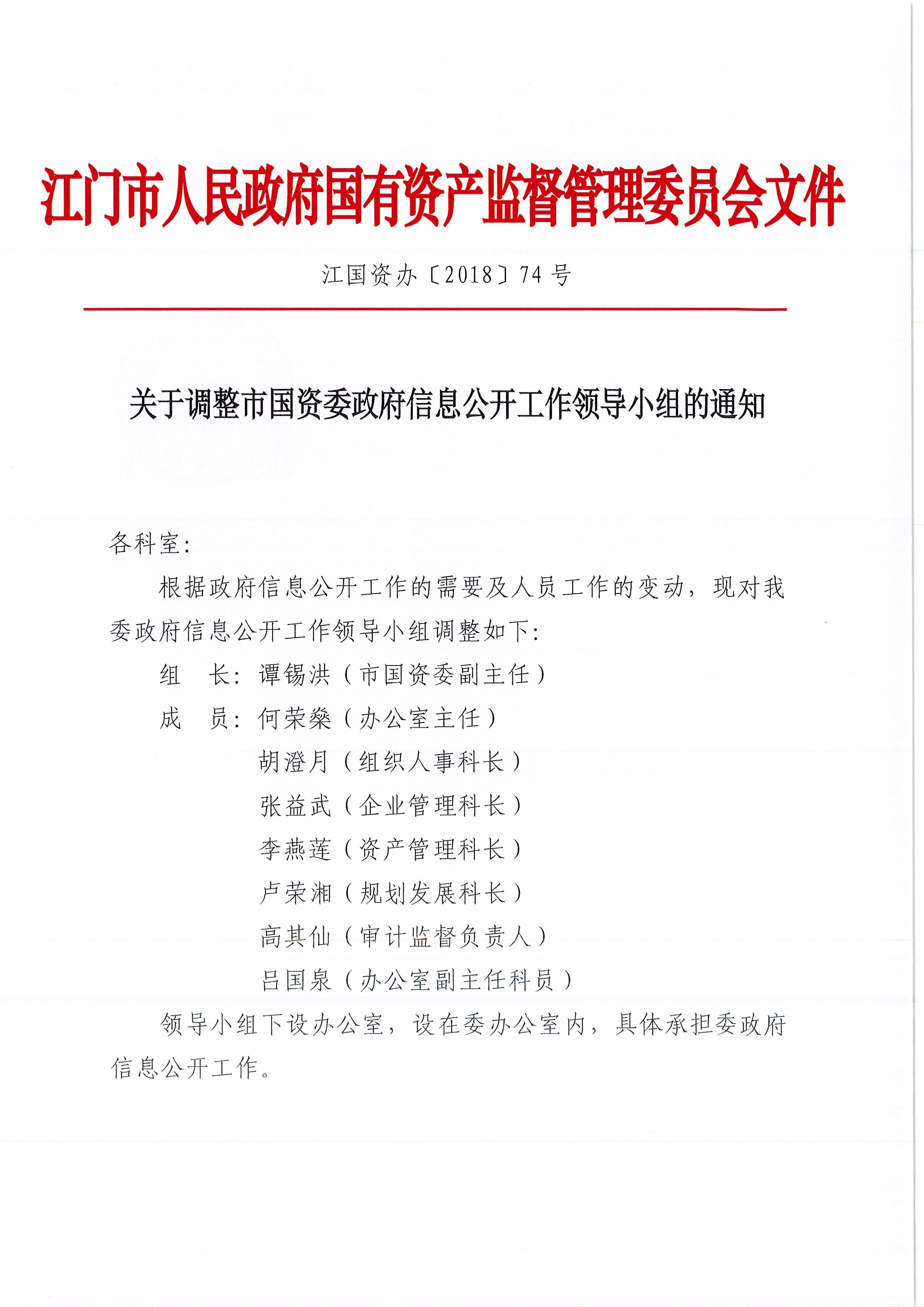 关于调整市国资委政府信息公开工作领导小组的通知