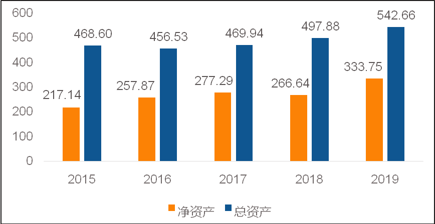 江门市国资总体规模和资产经营效益保持平稳增长。市属国有企业总资产由2015年468.60亿元增长至2019年542.66亿元,年复合增长率(即CAGR)为3.74%;所有者权益由2015年的217.14亿元增长至2019年的333.75亿元,年复合增长率达11.34%。