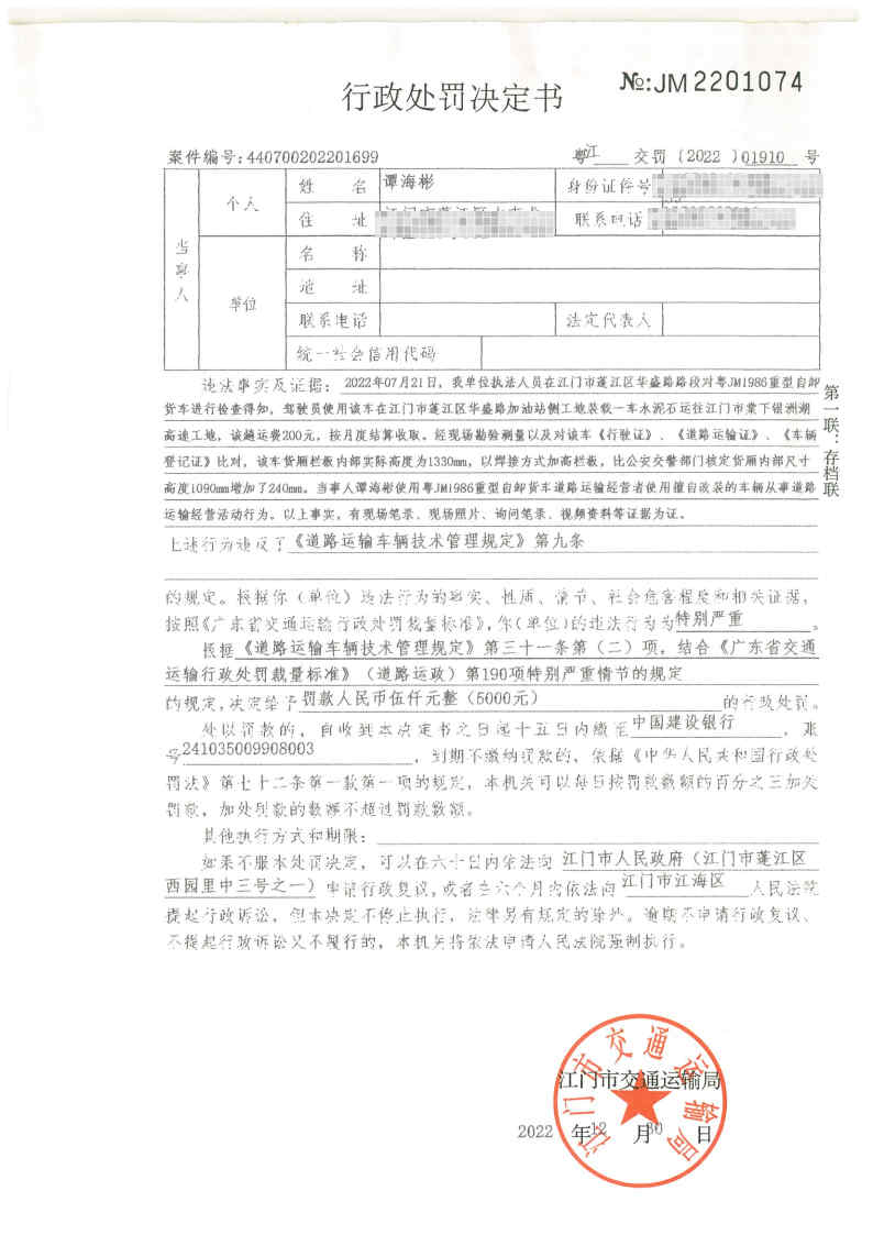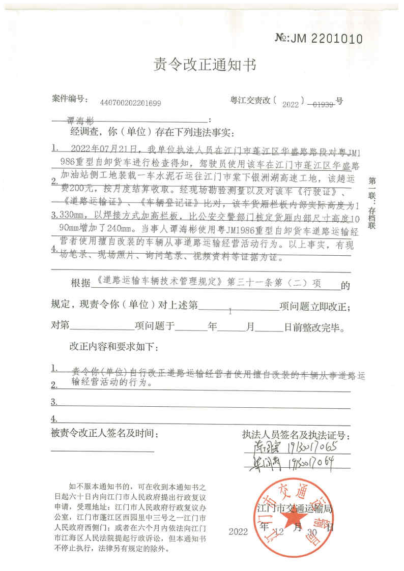 你(单位)因违反交通运输行政管理法规,本机关已作出行政处罚决定和责令改正通知书(具体内容详见附件)。依照《中华人民共和国民事诉讼法》第九十二条的规定,因受送达人采用其他方式无法送达,现向你(单位)公告送达《行政处罚决定书》和《责令改正通知书》。自公告之日起,经过30日即视为送达。