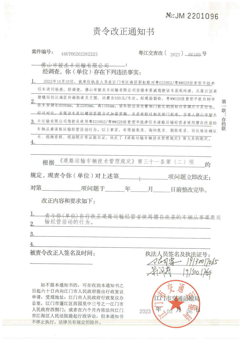 你(单位)因违反交通运输行政管理法规,本机关已作出行政处罚决定和责令改正通知书(具体内容详见附件)。依照《中华人民共和国民事诉讼法》第九十二条的规定,因受送达人采用其他方式无法送达,现向你(单位)公告送达《行政处罚决定书》和《责令改正通知书》。自公告之日起,经过30日即视为送达。