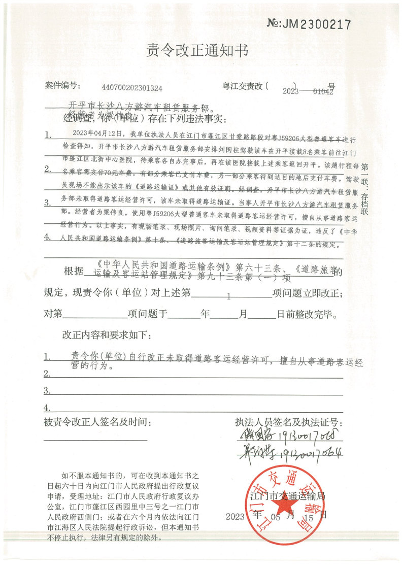 你(单位)因违反交通运输行政管理法规,本机关已作出行政处罚决定和责令改正通知书(具体内容详见附件)。依照《中华人民共和国民事诉讼法》第九十二条的规定,因受送达人采用其他方式无法送达,现向你(单位)公告送达《行政处罚决定书》和《责令改正通知书》。自公告之日起,经过30日即视为送达。