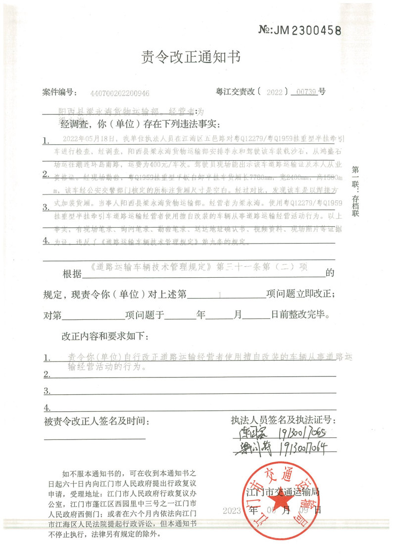 你(单位)因违反交通运输行政管理法规,本机关已作出行政处罚决定和责令改正通知书(具体内容详见附件)。依照《中华人民共和国民事诉讼法》第九十二条的规定,因受送达人采用其他方式无法送达,现向你(单位)公告送达《行政处罚决定书》和《责令改正通知书》。自公告之日起,经过30日即视为送达。