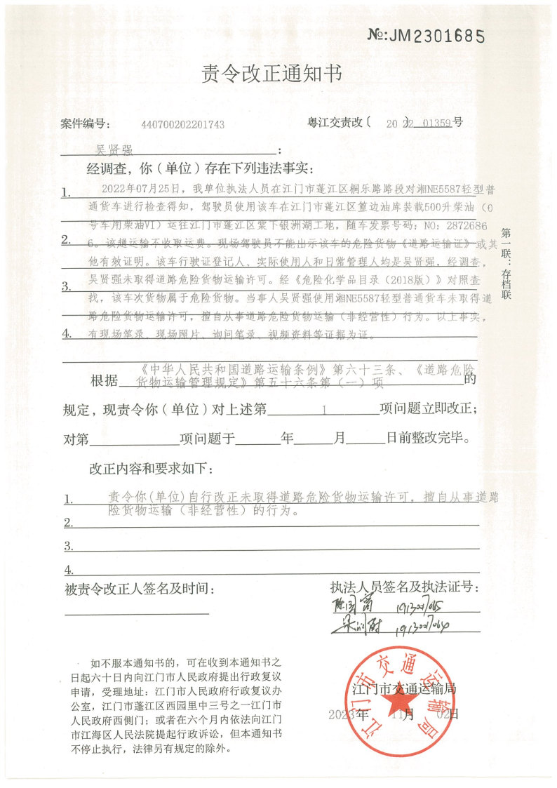 你因违反交通运输行政管理法规,本机关已作出行政处罚决定和责令改正通知书(具体内容详见附件)。依照《中华人民共和国民事诉讼法》第九十二条的规定,因受送达人采用其他方式无法送达,现向你(单位)公告送达《行政处罚决定书》和《责令改正通知书》。自公告之日起,经过30日即视为送达。