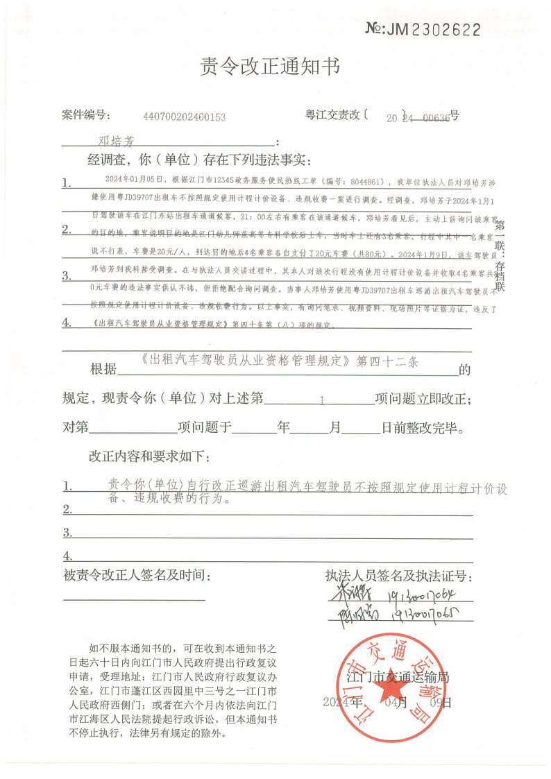 你(单位)因违反交通运输行政管理法规,本机关已作出行政处罚决定和责令改正通知书(详见附件)。依照《中华人民共和国民事诉讼法》第九十五条的规定,因受送达人采用其他方式无法送达,现向你(单位)公告送达《行政处罚决定书》和《责令改正通知书》。自公告之日起,经过30日即视为送达。
