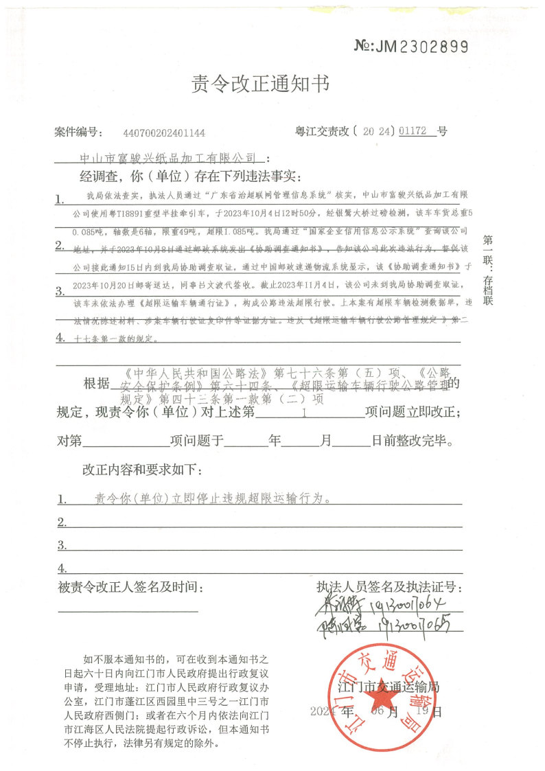 你(单位)因违反交通运输行政管理法规,本机关已作出行政处罚决定和责令改正通知书(具体内容详见附件)。依照《中华人民共和国民事诉讼法》第九十五条的规定,因受送达人采用其他方式无法送达,现向你(单位)公告送达《行政处罚决定书》和《责令改正通知书》。自公告之日起,经过30日即视为送达。