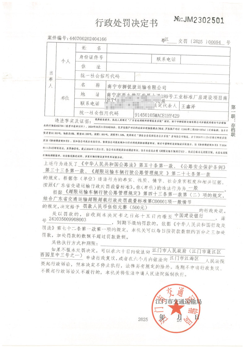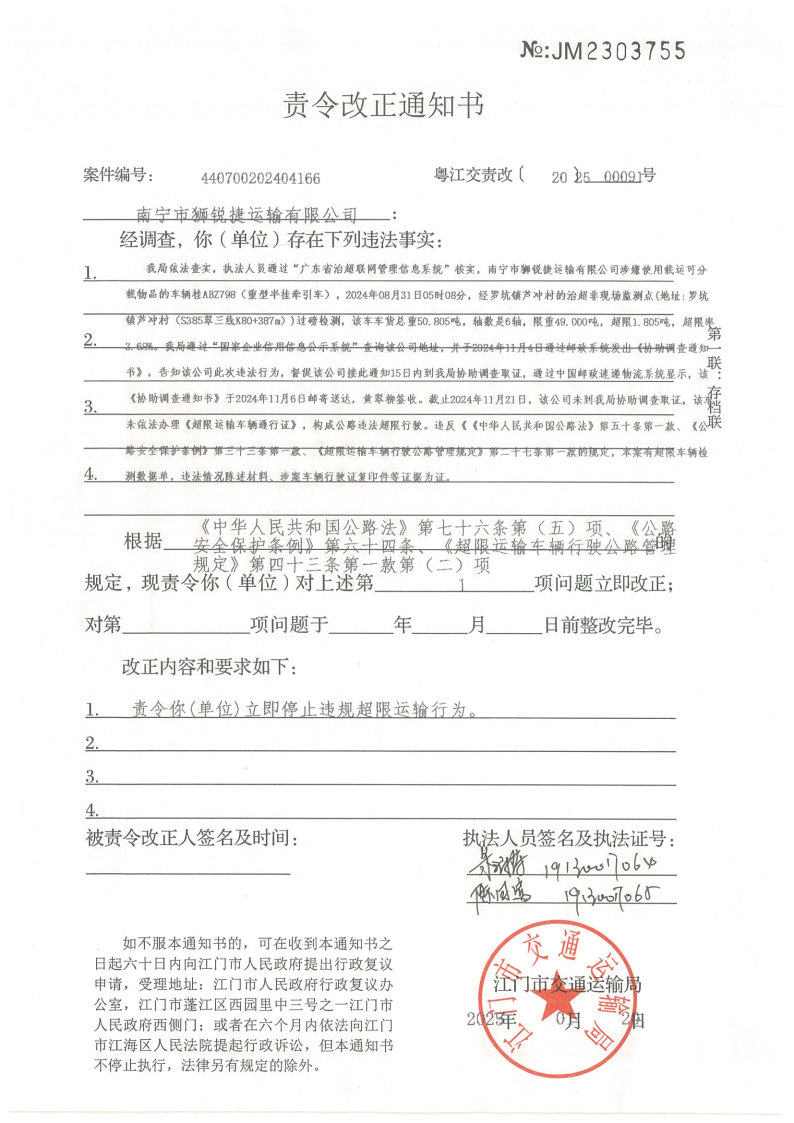 你(单位)因违反交通运输行政管理法规,本机关已作出行政处罚决定和责令改正通知书(具体内容详见附件)。依照《中华人民共和国民事诉讼法》第九十五条的规定,因受送达人采用其他方式无法送达,现向你(单位)公告送达《行政处罚决定书》和《责令改正通知书》。自公告之日起,经过30日即视为送达。