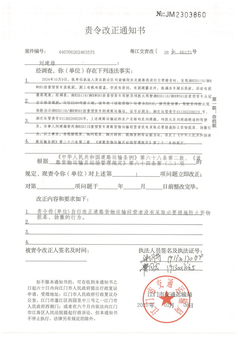 你(单位)因违反交通运输行政管理法规,本机关已作出行政处罚决定和责令改正通知书(具体内容详见附件)。依照《中华人民共和国民事诉讼法》第九十五条的规定,因受送达人采用其他方式无法送达,现向你(单位)公告送达《行政处罚决定书》和《责令改正通知书》。自公告之日起,经过30日即视为送达。