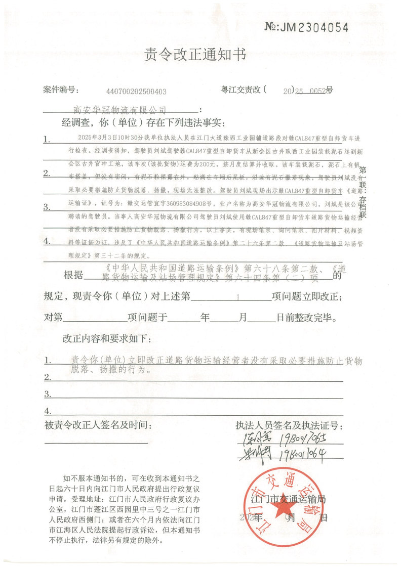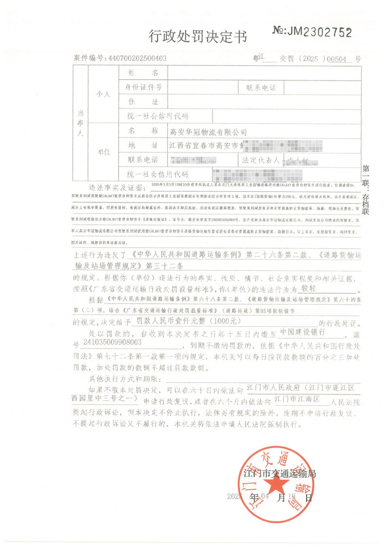 你(单位)因违反交通运输行政管理法规,本机关已作出行政处罚决定和责令改正通知书(具体内容详见附件)。依照《中华人民共和国民事诉讼法》第九十五条的规定,因受送达人采用其他方式无法送达,现向你(单位)公告送达《行政处罚决定书》和《责令改正通知书》。自公告之日起,经过30日即视为送达。