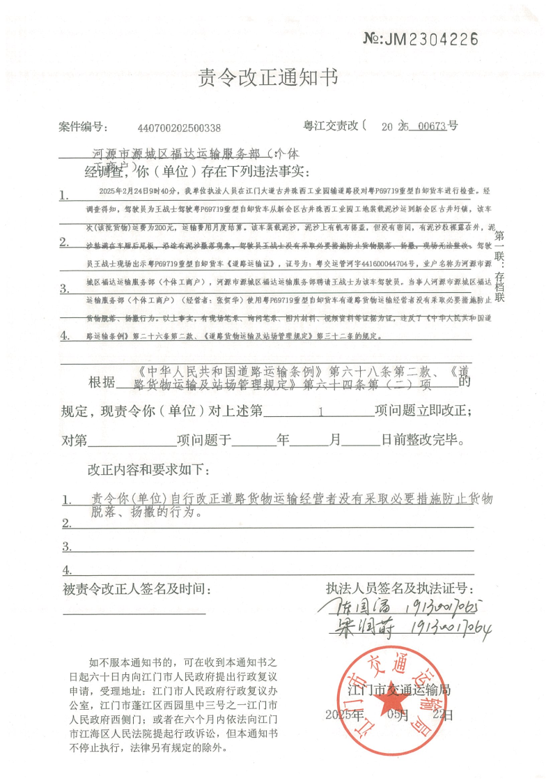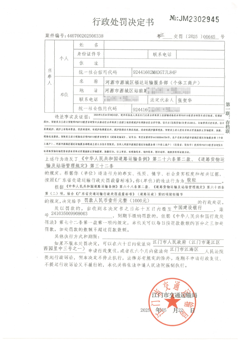 你(单位)因违反交通运输行政管理法规,本机关已作出行政处罚决定和责令改正通知书(具体内容详见附件)。依照《中华人民共和国民事诉讼法》第九十五条的规定,因受送达人采用其他方式无法送达,现向你(单位)公告送达《行政处罚决定书》和《责令改正通知书》。自公告之日起,经过30日即视为送达。