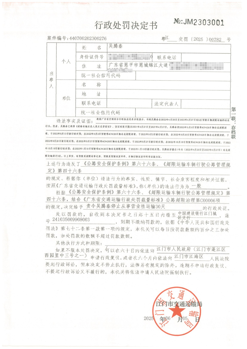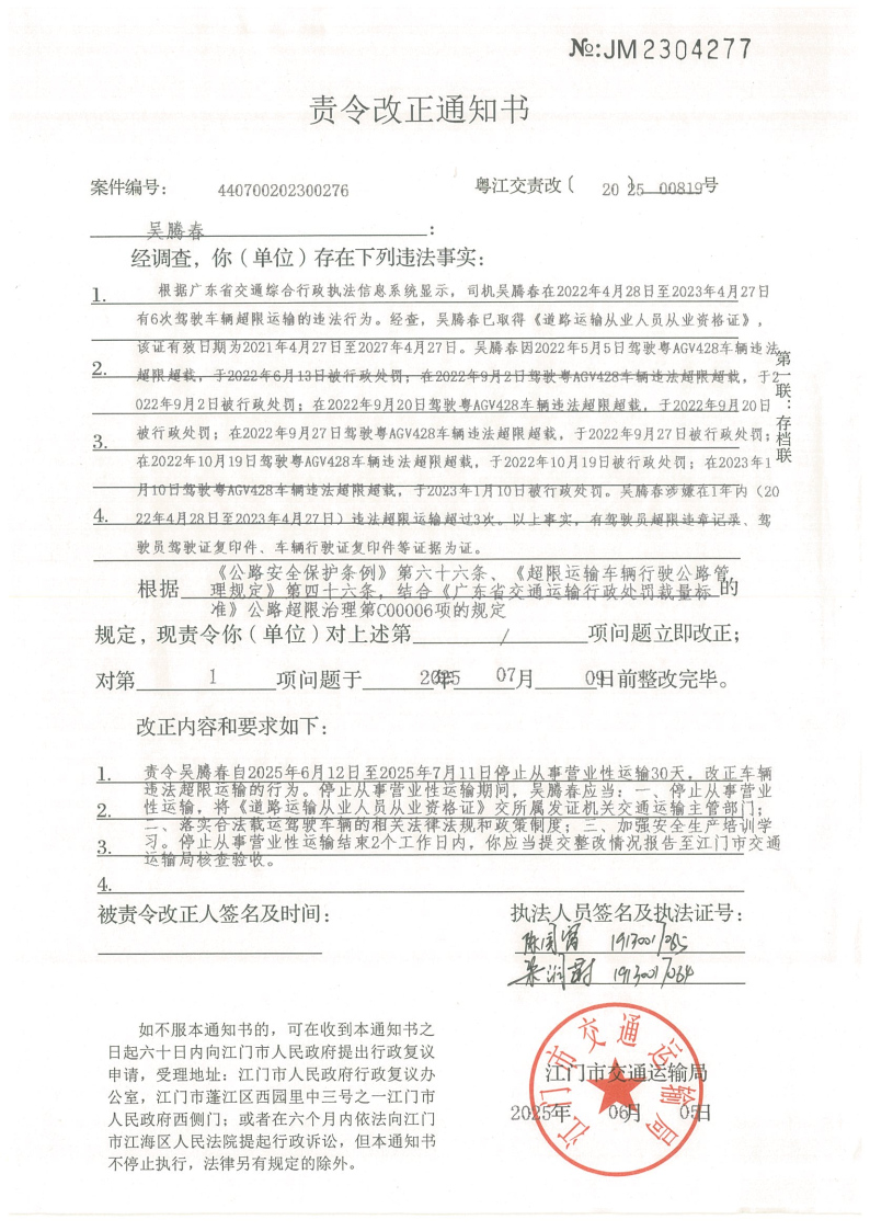 你(单位)因违反交通运输行政管理法规,本机关已作出行政处罚决定和责令改正通知书(具体内容详见附件)。依照《中华人民共和国民事诉讼法》第九十五条的规定,因受送达人采用其他方式无法送达,现向你(单位)公告送达《行政处罚决定书》和《责令改正通知书》。自公告之日起,经过30日即视为送达。