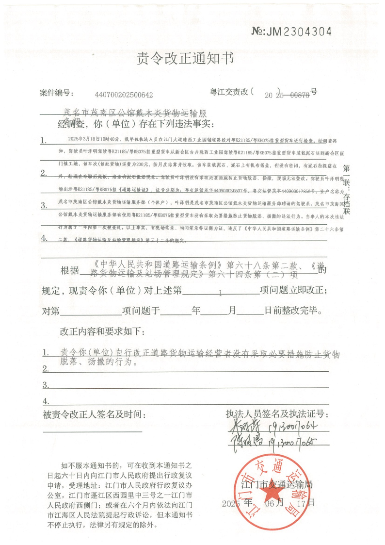 你(单位)因违反交通运输行政管理法规,本机关已作出行政处罚决定和责令改正通知书(具体内容详见附件)。依照《中华人民共和国民事诉讼法》第九十五条的规定,因受送达人采用其他方式无法送达,现向你(单位)公告送达《行政处罚决定书》和《责令改正通知书》。自公告之日起,经过30日即视为送达。