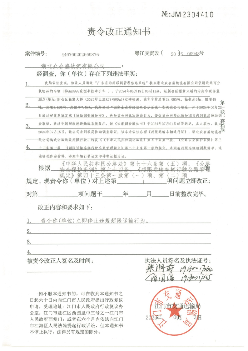 你(单位)因违反交通运输行政管理法规,本机关已作出行政处罚决定和责令改正通知书(具体内容详见附件)。依照《中华人民共和国民事诉讼法》第九十五条的规定,因受送达人采用其他方式无法送达,现向你(单位)公告送达《行政处罚决定书》和《责令改正通知书》。自公告之日起,经过30日即视为送达。