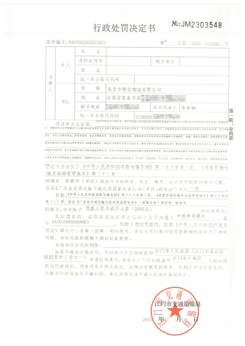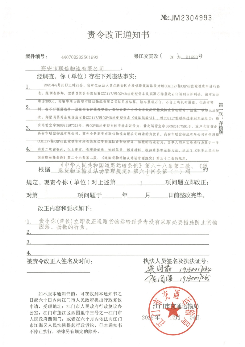 你(单位)因违反交通运输行政管理法规,本机关已作出行政处罚决定和责令改正通知书(具体内容详见附件)。依照《中华人民共和国民事诉讼法》第九十五条的规定,因无法以其他方式向你(单位)送达,现向你(单位)公告送达《行政处罚决定书》和《责令改正通知书》。自发出公告之日起,经过30日即视为送达。