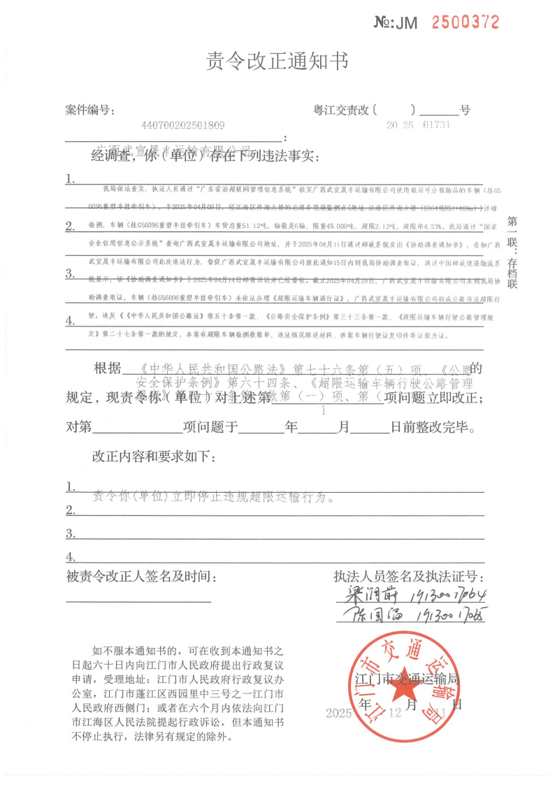 你(单位)因违反交通运输行政管理法规,本机关已作出行政处罚决定和责令改正通知书(具体内容详见附件)。依照《中华人民共和国民事诉讼法》第九十五条的规定,因无法以其他方式向你(单位)送达,现向你(单位)公告送达《行政处罚决定书》和《责令改正通知书》。自发出公告之日起,经过30日即视为送达。