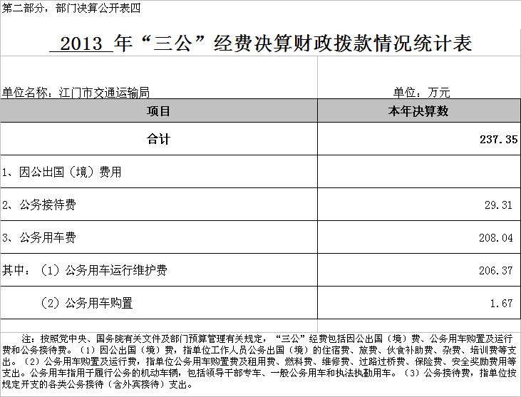 2013 年江门市交通运输局(含下属单位)用财政拨款开支的出国(境)经费、车辆购置及运行费、公务接待费(简称“三公”经费)支出合计237.35万元。
