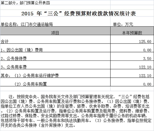 2015 年江门市交通运输局(含下属单位)用财政拨款数开支的出国(境)经费、车辆购置及运行费、公务接待费(简称“三公”经费)支出合计125.60万元。