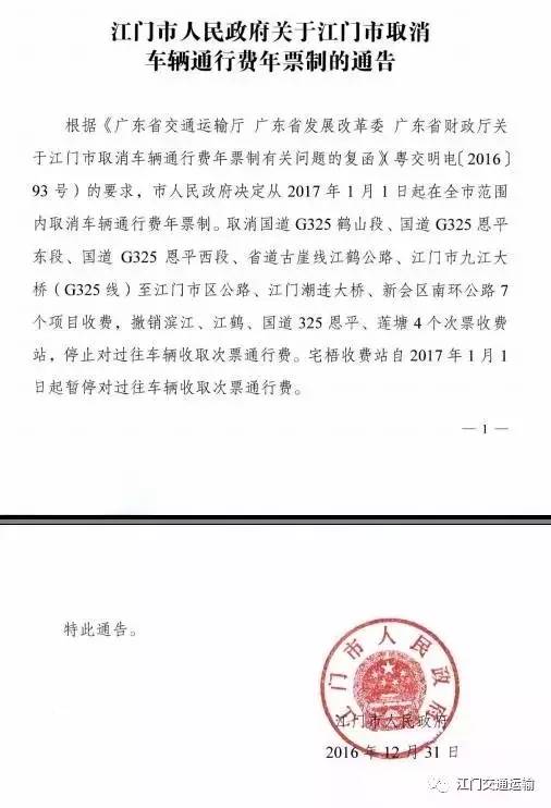 根据《广东省交通运输厅 广东省发展改革委 广东省财政厅关于江门市取消车辆通行费年票制有关问题的复函》(粤交明电〔2016〕93号)的要求,市人民政府决定从2017年1月1日起在全市范围内取消车辆通行费年票制。取消国道G325鹤山段、国道G325恩平东段、国道G325恩平西段、省道古崖线江鹤公路、江门市九江大桥(G325线)至江门市区公路、江门潮连大桥、新会区南环公路7个项目收费,撤销滨江、江鹤、国道325恩平、莲塘4个次票收费站,停止对过往车辆收取次票通行费。宅梧收费站自2017年1月1日起暂停对过往车辆收取次票通行费。
