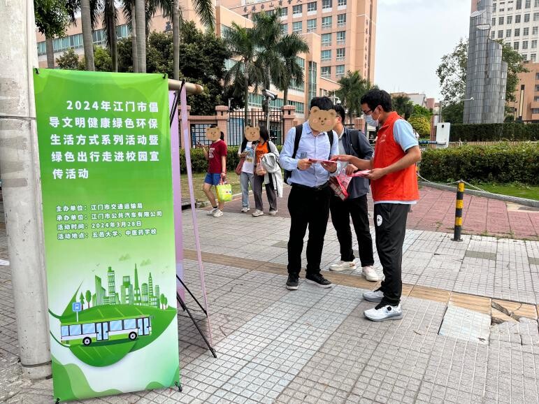 为宣传绿色出行理念,培育文明、健康、绿色、低碳的出行习惯,2024年3月28日,我局在五邑大学、中医药学校开展以“绿色出行走进校园”为主题的2024年绿色出行系列宣传活动。
