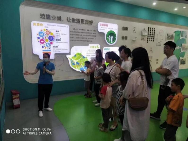(在“两馆一中心”,学生和家长们跟随着工作人员的步伐,在游戏中参观学习了垃圾分类科普体验馆、科技馆等,充实科学知识)