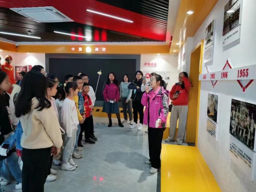 (在崖门坑口消防体验馆,学生和家长在专业讲解员的带领下,了解到如何在逃生绳上打逃生结等知识,现场学生们认真学习消防知识,踊跃举手抢答消防问题)