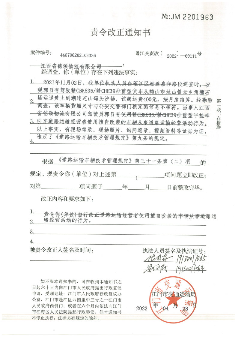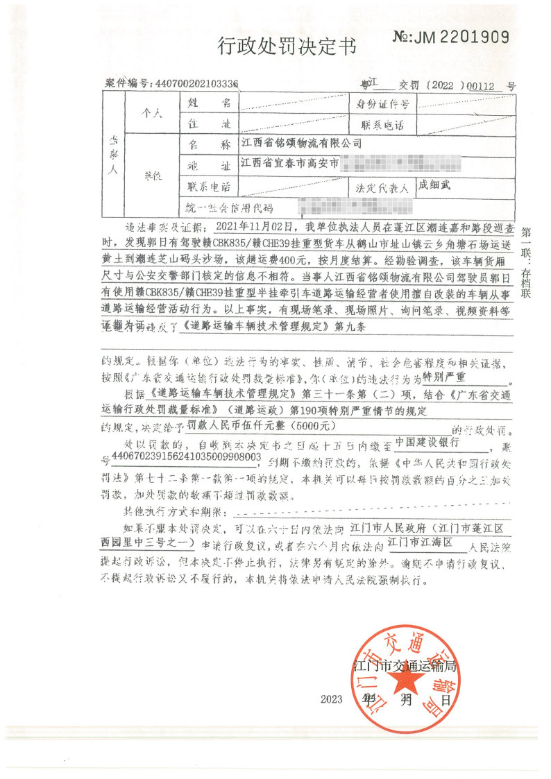 你(单位)因违反交通运输行政管理法规,本机关已作出行政处罚决定和责令改正通知书(具体内容详见附件)。依照《中华人民共和国民事诉讼法》第九十二条的规定,因受送达人采用其他方式无法送达,现向你(单位)公告送达《行政处罚决定书》和《责令改正通知书》。自公告之日起,经过30日即视为送达。