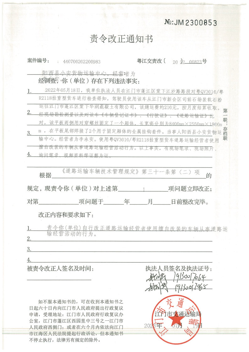你(单位)因违反交通运输行政管理法规,本机关已作出行政处罚决定和责令改正通知书(具体内容详见附件)。依照《中华人民共和国民事诉讼法》第九十二条的规定,因受送达人采用其他方式无法送达,现向你(单位)公告送达《行政处罚决定书》和《责令改正通知书》。自公告之日起,经过30日即视为送达。