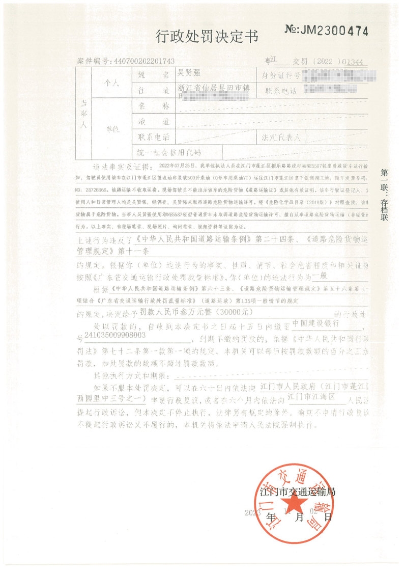 你因违反交通运输行政管理法规,本机关已作出行政处罚决定和责令改正通知书(具体内容详见附件)。依照《中华人民共和国民事诉讼法》第九十二条的规定,因受送达人采用其他方式无法送达,现向你(单位)公告送达《行政处罚决定书》和《责令改正通知书》。自公告之日起,经过30日即视为送达。