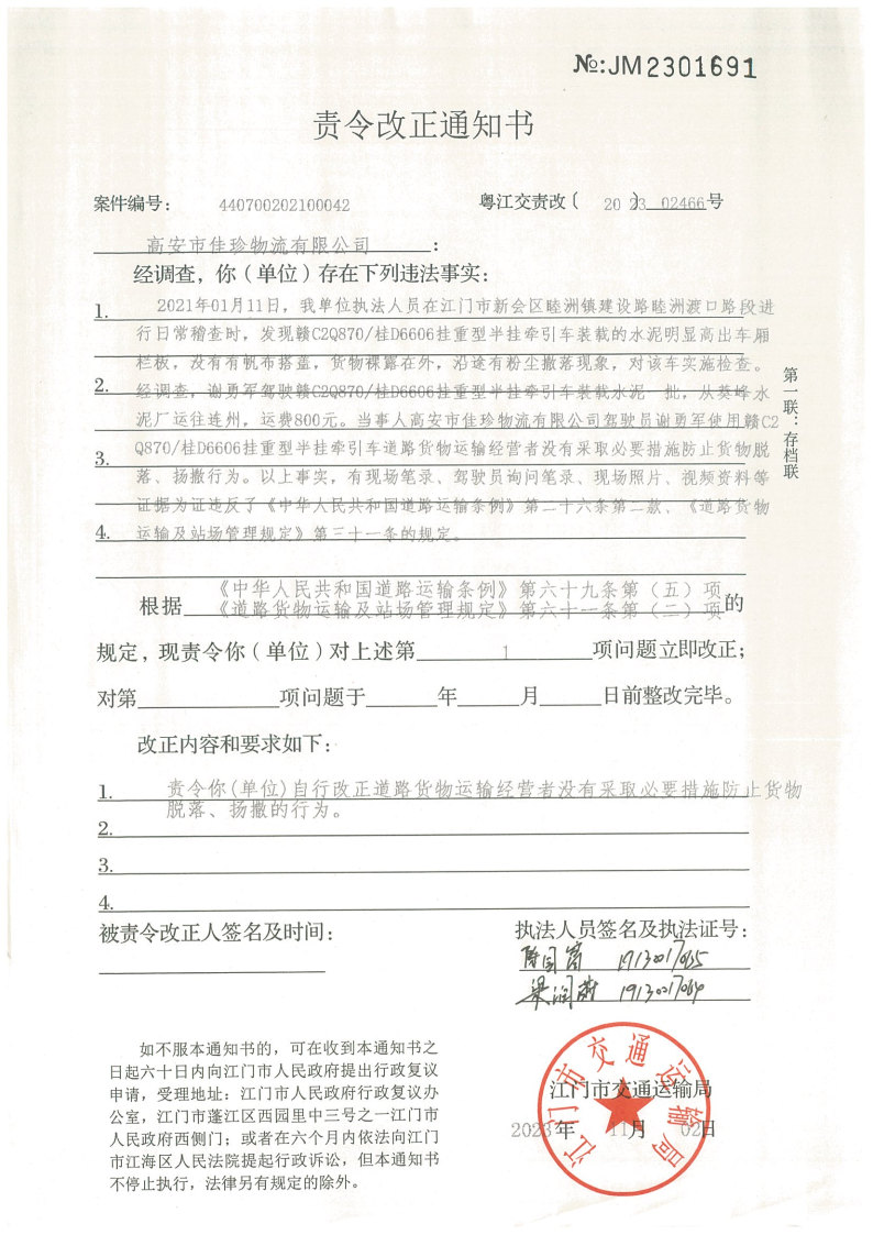 你(单位)因违反交通运输行政管理法规,本机关已作出行政处罚决定和责令改正通知书(具体内容详见附件)。依照《中华人民共和国民事诉讼法》第九十二条的规定,因受送达人采用其他方式无法送达,现向你(单位)公告送达《行政处罚决定书》和《责令改正通知书》。自公告之日起,经过30日即视为送达。